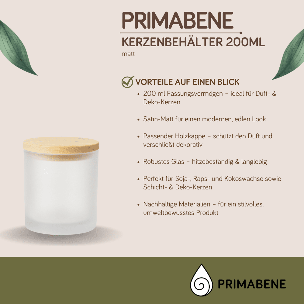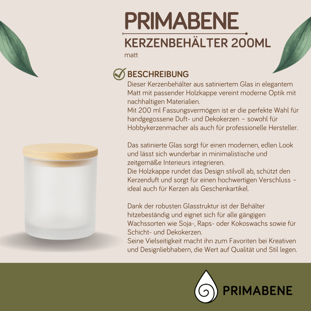 This frosted glass candle container in elegant matte with a matching wooden lid combines modern aesthetics with sustainable materials. With a capacity of 200 ml, it is the perfect choice for hand-poured scented and decorative candles – both for hobby candle makers and professional manufacturers. The frosted glass ensures a modern, classy look and can be wonderfully integrated into minimalist and contemporary interiors. The wooden lid stylishly completes the design, protects the candle's scent, and provides a high-quality closure – ideal for candles as gift items. Thanks to the robust glass structure, the container is heat-resistant and suitable for all common types of wax such as soy, rapeseed, or coconut wax, as well as for layered and decorative candles. Its versatility makes it a favorite among creatives and design enthusiasts who value quality and style.