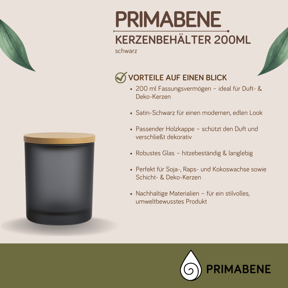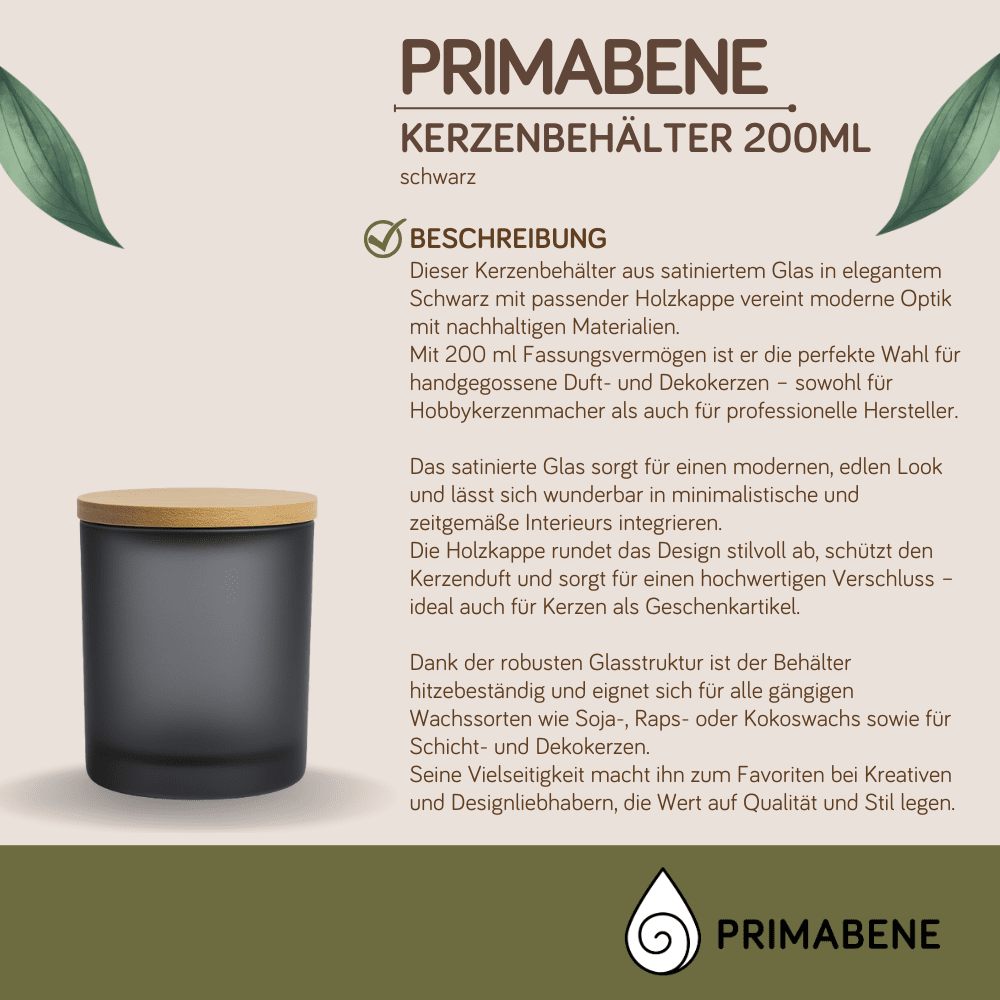 This candle holder made of frosted glass in elegant black with a matching wooden lid combines modern aesthetics with sustainable materials. With a capacity of 200 ml, it is the perfect choice for hand-poured scented and decorative candles – suitable for both hobby candlemakers and professional manufacturers.