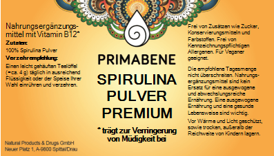 PRIMABENE® Spirulina Powder PREMIUM is 100% sourced from Austria. The dark green powder contains all essential amino acids and provides vegan protein, high amounts of vitamin K, and natural antioxidants such as vitamin A and phycocyanin. Spirulina contains vitamin B12, which helps to reduce fatigue (4 g contains 0.8 mcg of vitamin B12 (recommended daily dose 34% NRV**) (**=% of the reference intake according to Regulation (EU) No. 1169/2011). PRIMABENE® Spirulina Powder PREMIUM is used as a dietary supplement. It can be easily mixed into smoothies, yogurts, or shakes.