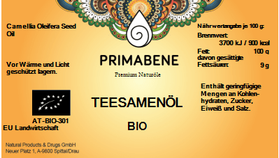 PRIMABENE® organic tea seed oil, also known as camellia seed oil, comes from organic cultivation and is obtained through pressing and liquid extraction from the seeds of the tea tree. The seeds have a very high oil content (70-87%) and are rich in oleic acid, linoleic acid, and palmitic acid as well as important minerals and vitamins. The colorless to pale yellow tea seed oil has a slightly sweet scent and is neutral in taste. Therefore, it can also be universally used in the kitchen. In China and Japan, tea seed oil is used as a versatile cooking oil, comparable to olive oil in Europe.