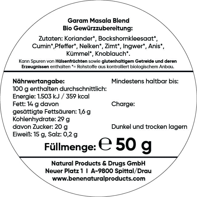 Zutaten: Koriander*, Bockshornkleesaat*, Cumin*, Pfeffer*, Nelken*, Zimt*, Ingwer*, Anis*, Kümmel*, Knoblauch*.