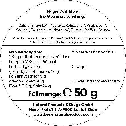 Zutaten: Paprika*, Meersalz, Rohrzucker*, Knoblauch*, Chillies*, Zwiebeln*, Muskatnuss*, Cumin*, Pfeffer*, Rauch.
